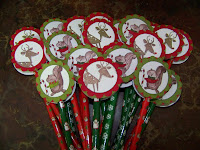 What a beautiful day! Even if the sun wasn't out I'd be happy - cuz it's not snowing! (What a change from Sunday, I was loving the snow Sunday, now I've had enough!) So Tuesday the girls and I made little gifts for all the kids in Hannah's class, it's just a very simple and inexpensive - they're pencils with little Christmas toppers! We used the Merry Crittermas set (wish I would've bought this set sooner! You can order it up to January 3rd http://www.stampaholicsteph.stampinup.net/ to order online! The other one uses a retired set I picked up last month at a show in St.Thomas, it's called Moose You - it's quite cute, and although I try not to buy retired items, this one was too cute to pass up! I used the 1 3/8" cirlce punch, layered on the scallop circle punch and then layered again on the 1 3/4" circle punch. I then used glue dots to adhere them to the pencils, and voila! On the back it says Merry Christmas and some of them Hannah printed on, but alot of them mommy did! Hope you like and thanks for stopping by! Steph